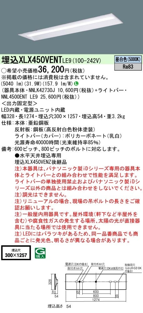 XLX450VENTLE9 【Panasonic 天井埋込型 40形 一体型LEDベースライト 下面開放型 Hf蛍光灯32形定格出力型2灯器具相当/Hf蛍光灯63形定格出力型1灯器具相当 Hf32形定格出力型2灯/Hf63形定格出力型・5200 lm】
